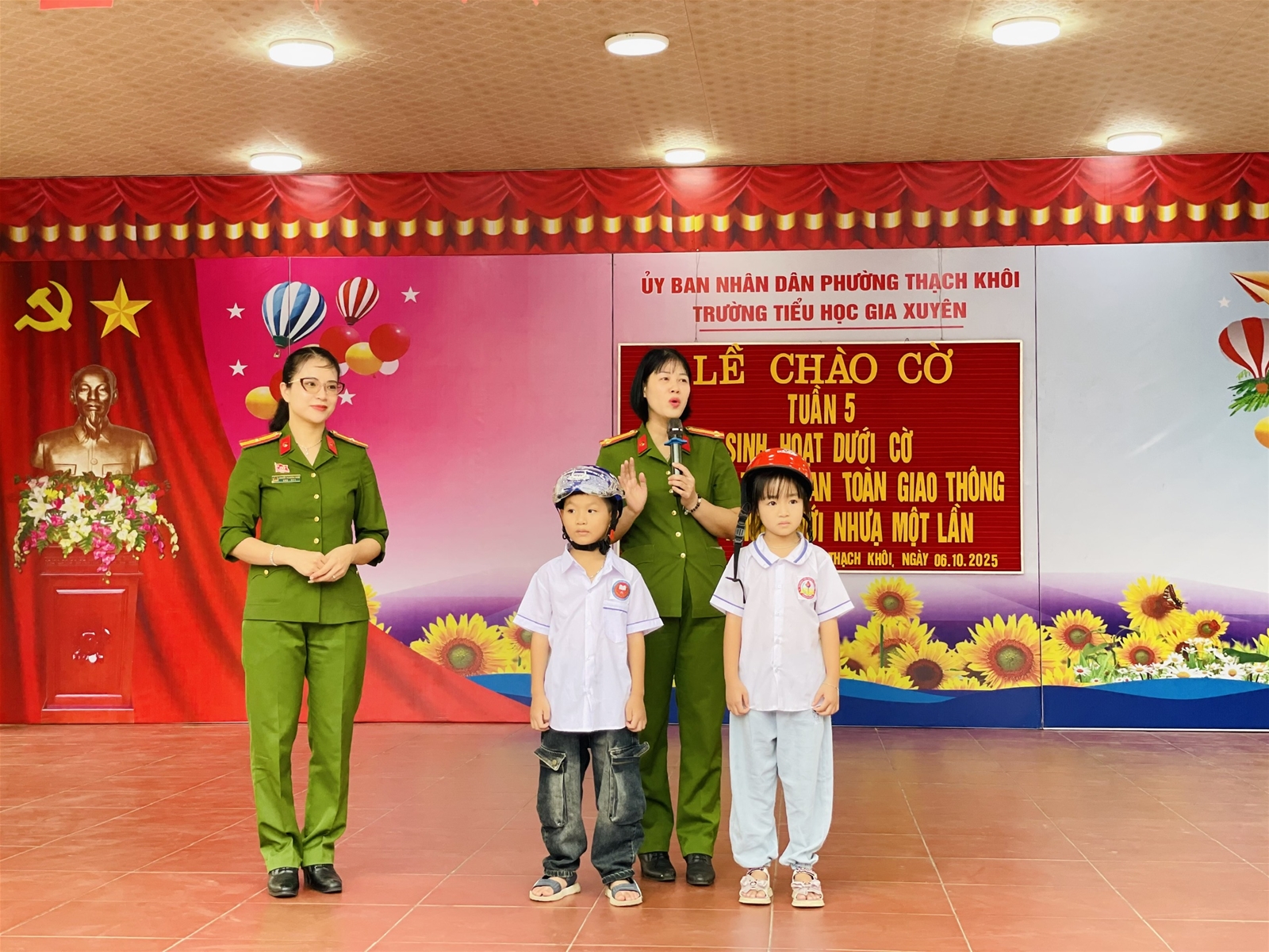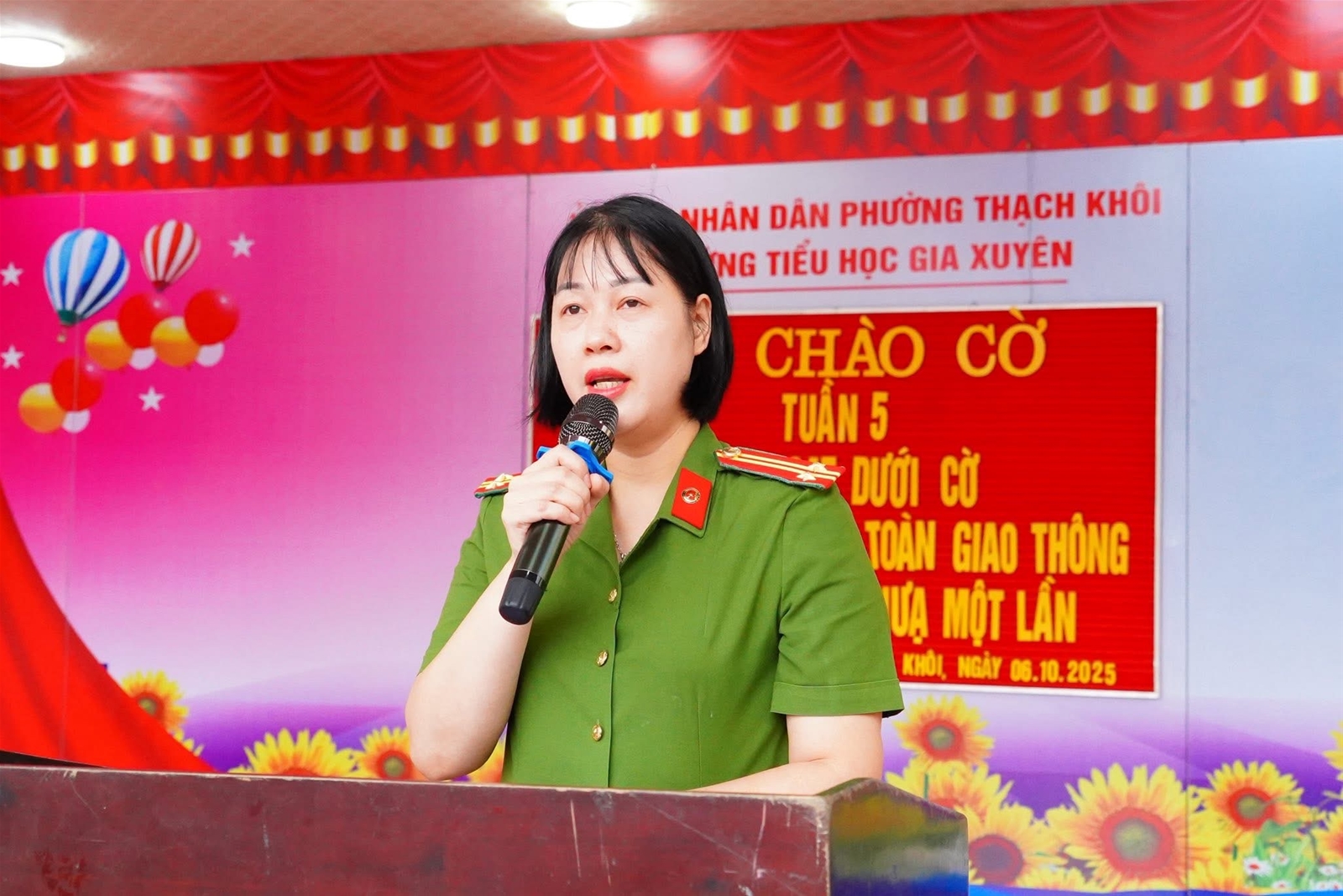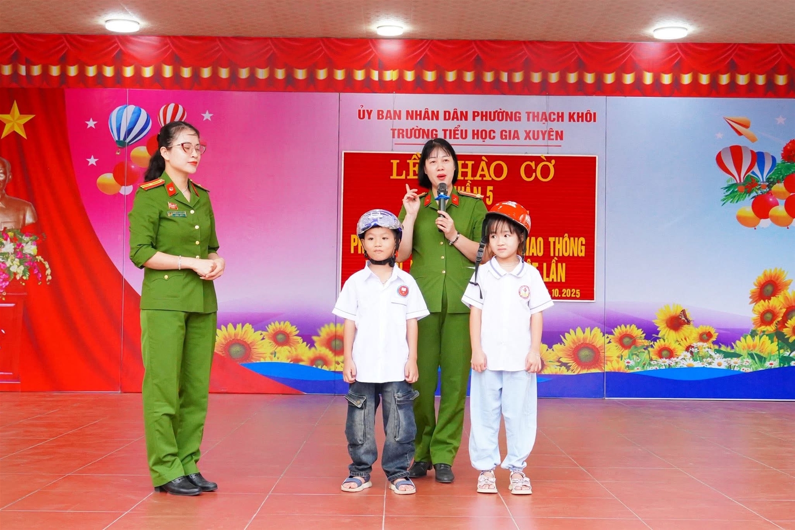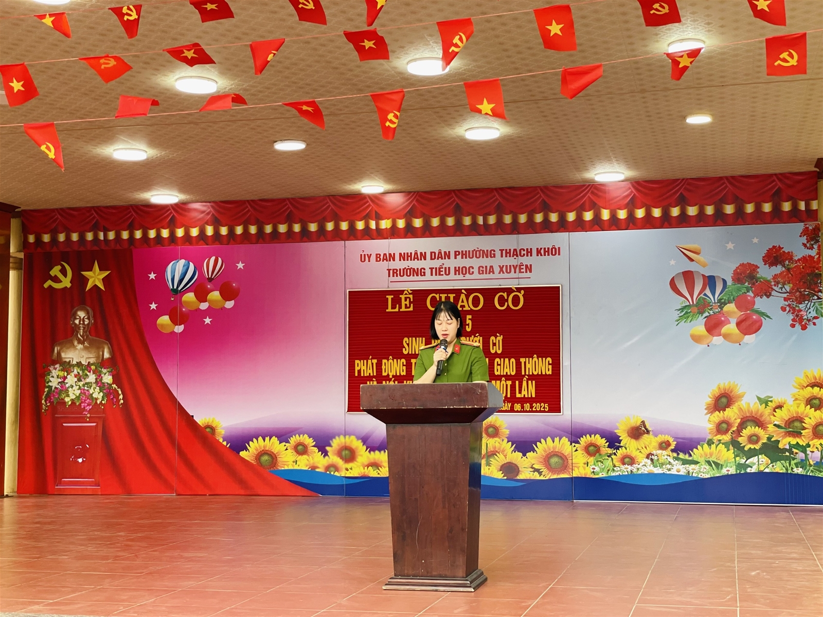 Nhằm nâng cao nhận thức về Luật An toàn giao thông, sáng ngày 06/10/2025, trong buổi sinh hoạt dưới cờ đầu tuần, trường Tiểu học Gia Xuyên đã phối hợp với Công an phường Thạch Khôi tổ chức tuyên truyền An toàn giao thông.
