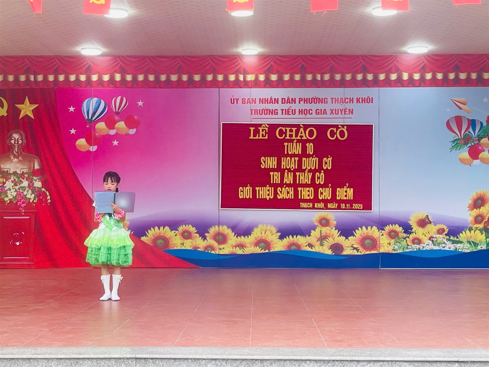 Ngày 10 tháng 11 năm 2025, Liên đội trường tiểu học Gia Xuyên tổ chức sinh hoạt dưới cờ Tuần 10 với chủ điểm: “Tri ân thầy cô – Giới thiệu sách theo chủ điểm”.